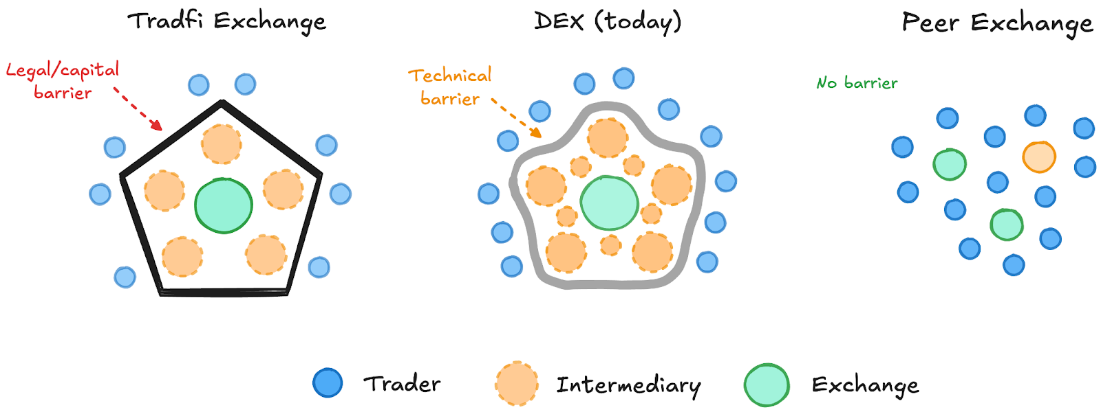 A peer exchange has all the logic it needs to operate – built in. Unlike DEXs today, which outsource operational logic (such as how to LP or how to align prices with the market) to external actors (like searchers, market makers, and professional LPs).